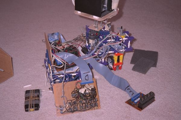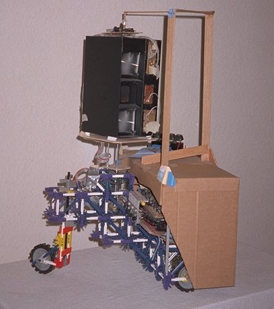 ERC is a small computer, a few motors, some cardboard, and a bunch of K'nex. For a long time it was a mobile robot, with differential drive, and I used it for many navigation experiments. At one time it had a downward looking light detector, and would chase the spot of a flash-light shined on the floor in front of it. Then it had an upward looking light detector, which would use a fixed light source as a navigation beacon. For a long time it had a scanning optical range finder and behavior pictured above and described below. ComputerA Motorola 68hc11 on a modified BotBoard. An expansion board provides 32k bytes RAM, 16 bits of parallel input, 16 bits of parallel output, and 32 multiplexed analog inputs. This is all a hand wired rats nest, but it works better than it looks. Range FinderIt has an oscillating scan platform with two seven zone, convergent mode, infrared, range finders. Seven IR emitters mounted behind the upper lens (pocket magnifier), produce beams that converge with the field of view of a detector (behind the lower lens), at different distances from about nine inches away, to nine feet away. ERC divides this 360 degree view into 32 directions, and for each gets a distance of one to seven, or beyond range. Crowd Interactive BehaviorERC's behavior has two main modes, attack, and flee. In the flee mode he will steer away from any thing in front of him, and will stop only when he sees nothing is within nine feet. In the attack mode he will steer toward, and follow what ever is in front of him. If it stops moving ERC will move up to it and stop, wait for a few seconds, then get bored and turn to attack in another direction. All of this software uses a subsumption approach somewhat like Rug Warrior, implemented in assembly language. UpdateAt this time ERC has been dismantled. Its scan platform had broken and I wanted to play with the K'nex. I still have all the parts and intend to turn it back into some kind of robot someday. In the future these parts may be something completely different, an arm perhaps? |