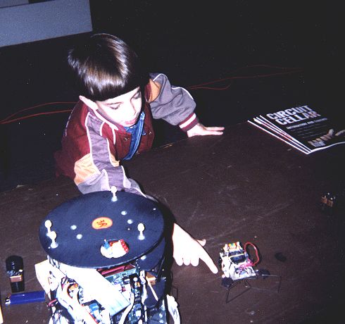 This simple robot was designed to be just smart enough to wander around on a table top without falling off of the edge. It also can see light from above, giving it a crude sense of direction. |